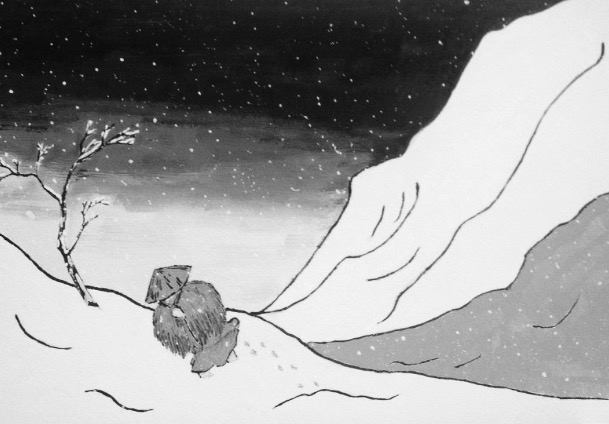 The wintry theme of the trilogy is meant to endorse the harshness of Nichiren’s exile. Despite this, it is clear that the first art piece is based on serenity and peaceful contemplation. Intriguingly, the second art piece focuses on the start of his bleak journey but solace can be seen in the background based on prior human contact. However, the third art piece depicts Nichiren against the harsh and bleak wintry conditions of Sado Island, whereby his exile looks treacherous.