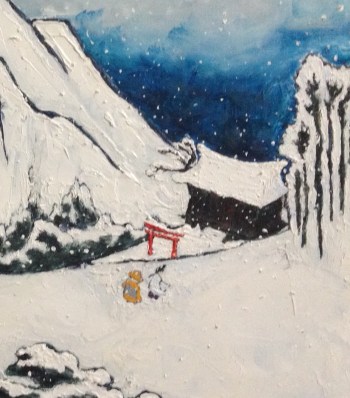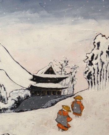 In the second part of Sawako Utsumi’s art that focuses on Buddhist and Shinto holy men in the snow, the contemporary Japanese artist once more works a treat. Of course, the art itself provides a lovely backdrop into the interrelationship between Buddhism and Shintoism that seems to flow naturally. Equally, the nuance of simplicity belies the shocking truth of how Buddhism was erased despite the mountains of Afghanistan and in other parts of the world.