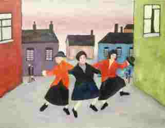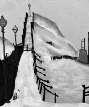 Thus the individuals (two adults and a child) walking in the direction of smoke-filled chimneys in the original by Lowry – and other angles of the backdrop of industrialization – are replaced by one individual with a heart full of love and hope (the two cats and a dog being the spirits that stay within the heart and only a memory away). Therefore, the scenery is lighter!