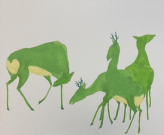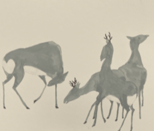 Sawako Utsumi is paying homage to Nakamura Hochu. However, she dramatically alters the color angle of the deer (inspired by the Edo Period artist Nakamura Hochu) and provides a Buddhist angle concerning her mindset.