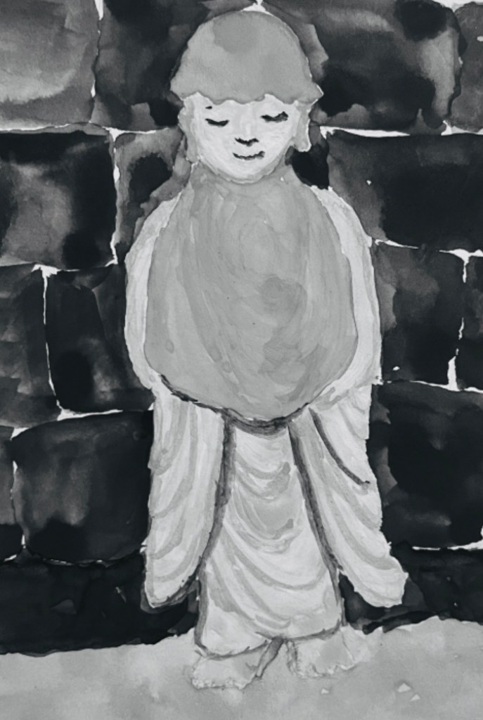 Overall, Utsumi portrays the spiritual presence of Jizō as partially revealed in this world—both visually and spiritually connected—yet enduring far beyond the fleeting existence of the viewer.