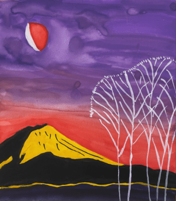 In the artwork above, Sawako Utsumi gently honors the legacy of Hagiwara Hideo (1913–2007), yet she breathes her own spirit into the canvas. A stark white tree rises boldly against a glowing yellow mountain, beneath a vivid, low-hanging red skyline—each element pulsating with energy, renewal, and life. Through these vibrant contrasts, she weaves a layered reinterpretation that both reveres and re-imagines the very soul of Hagiwara’s vision.